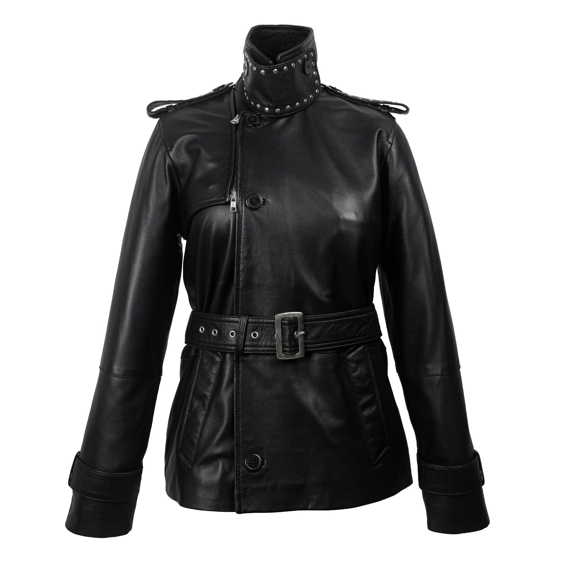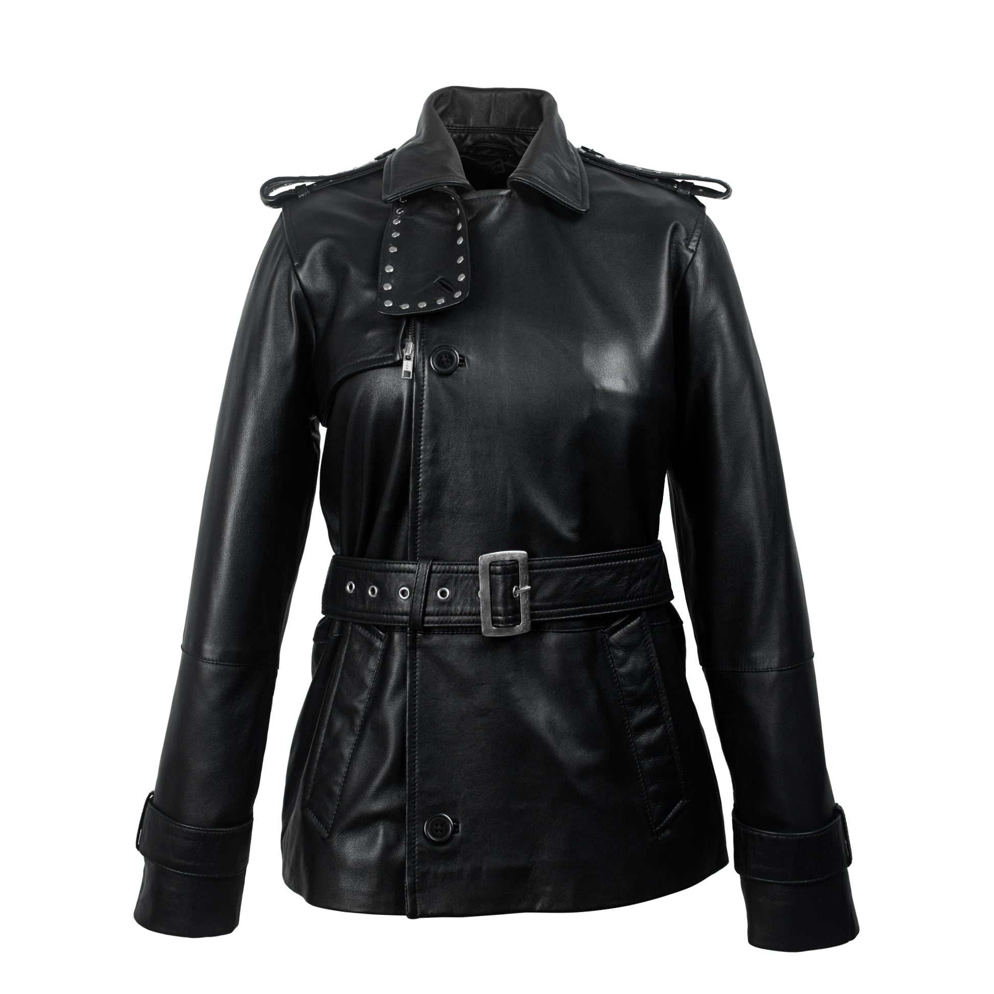 The Black Studded Leather Trench Jacket brings together bold styling and functional comfort. Crafted from premium genuine leather, this piece is designed to stand out with its high-neck structure, studded shoulder epaulettes, and clean silver hardware. Additionally, the asymmetrical zip closure and mid-thigh length give it a modern shape, while the belted waist lets you adjust the fit to your liking.