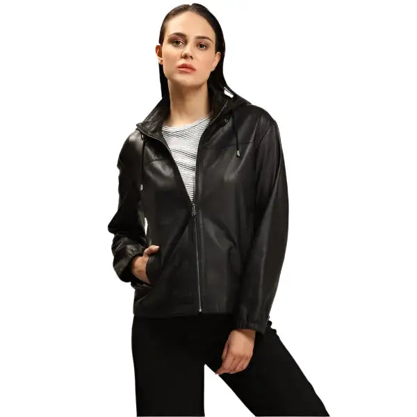 Upgrade your outerwear collection with this Women's Black Lambskin Leather Jacket with a Detachable Hood. Crafted from soft and luxurious lambskin leather, this jacket offers both elegance and comfort. The detachable hood adds versatility, allowing you to adapt to any weather or style preference. Whether you're dressing up for a night out or keeping it casual, this jacket is designed to make a lasting impression.